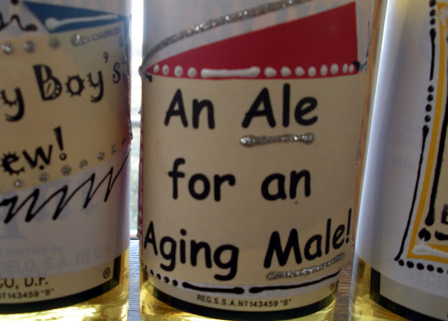 3) Make beer labels!  I made my labels decorating adhesive beer labels with Cardstock and 3d puff paint.  You might have other material you might want to make yours out of!